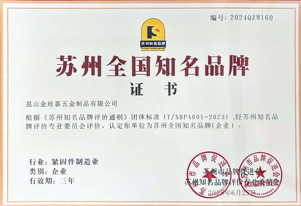 குன்ஷன்ஜின்சிக்சிமெட்டில்வேர் கோ, லிமிடெட் அதன் சிறந்த தயாரிப்பு தரம், முன்னணி தொழில்நுட்ப வலிமை, விரிவான சேவை அமைப்பு மற்றும் விரிவான சந்தை செல்வாக்கு ஆகியவற்றிற்காக "சுஜோவில் தேசிய புகழ்பெற்ற பிராண்ட்" என்ற பட்டத்தை அதிகாரப்பூர்வமாக வழங்கியுள்ளது!